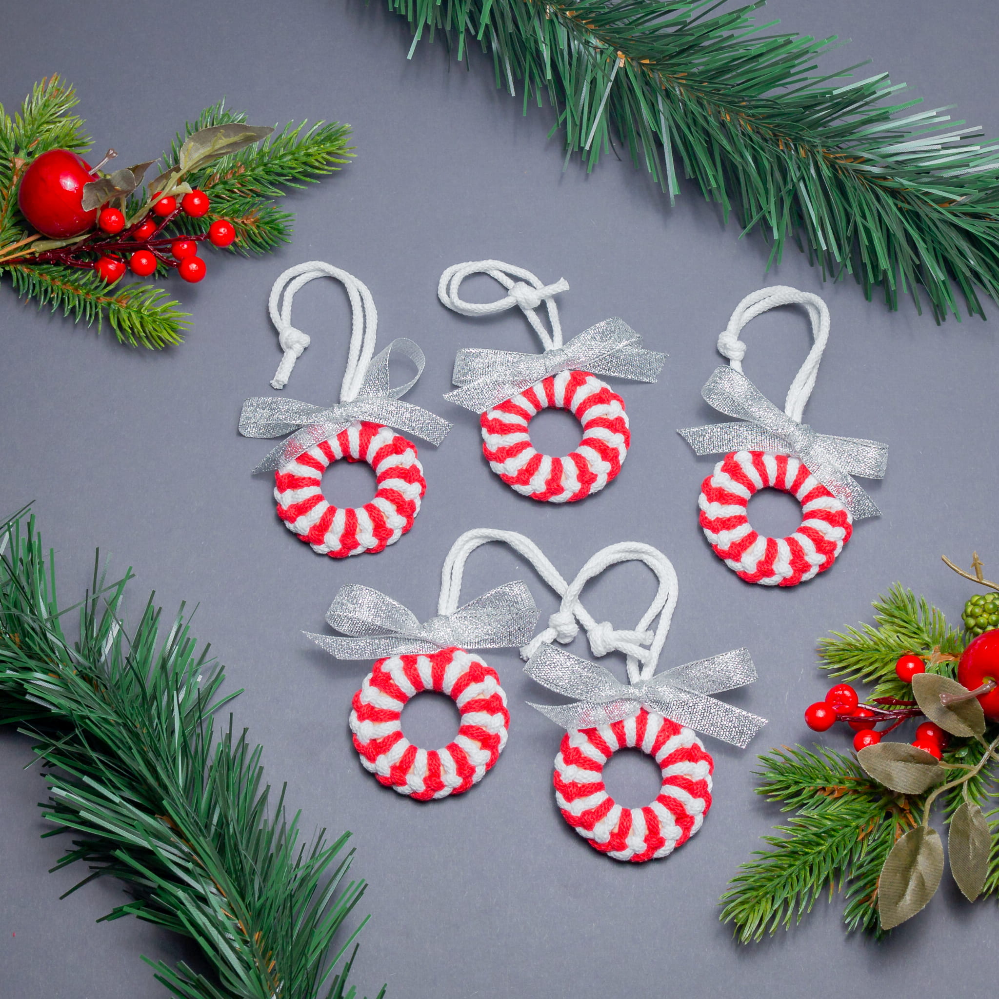 Kółeczka biało-czerwone 5 szt - zestaw ozdób świątecznych na choinkę z makramy