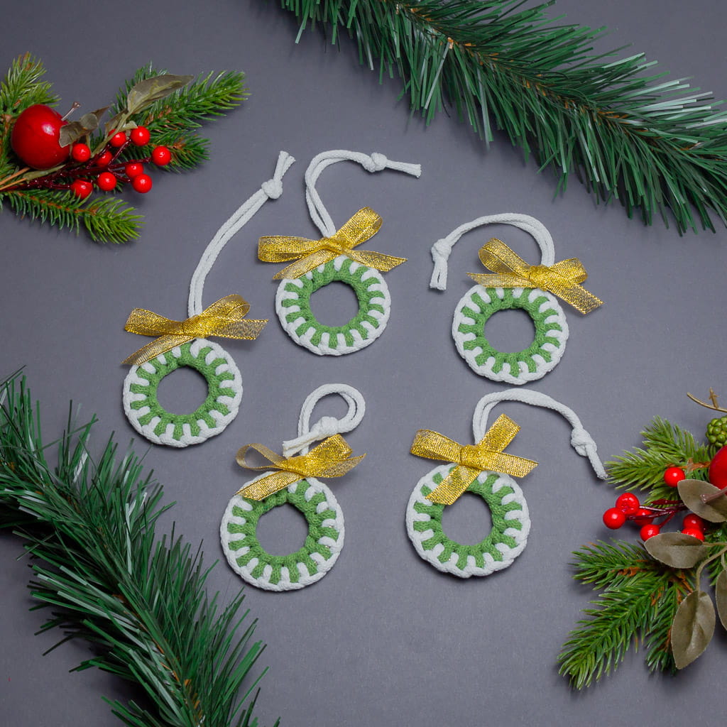 Kółeczka biało-zielone 5 szt - zestaw ozdób świątecznych na choinkę z makramy