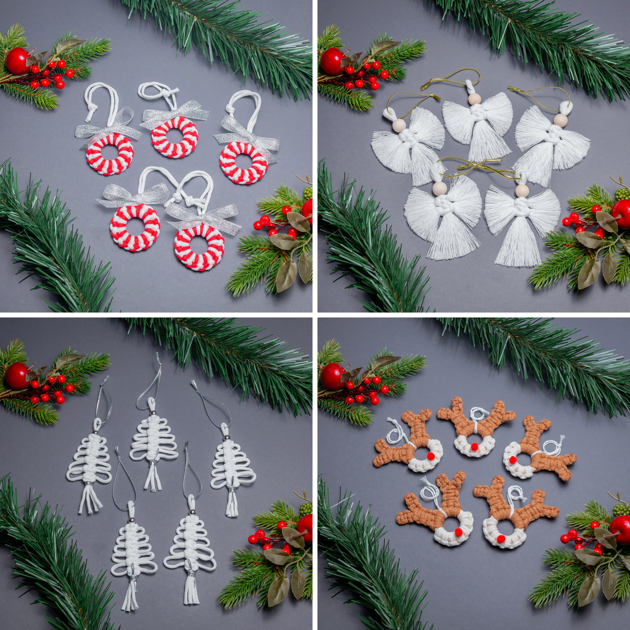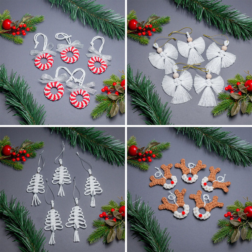 Zestaw czterech różnych ozdób choinkowych ręcznie wykonanych. Idealny na prezent dla tych co kochają minimalizm i naturalne wzory. Wszystkie ozdoby wykonane są metodą makramy ze sznurka i różnych dodatków.