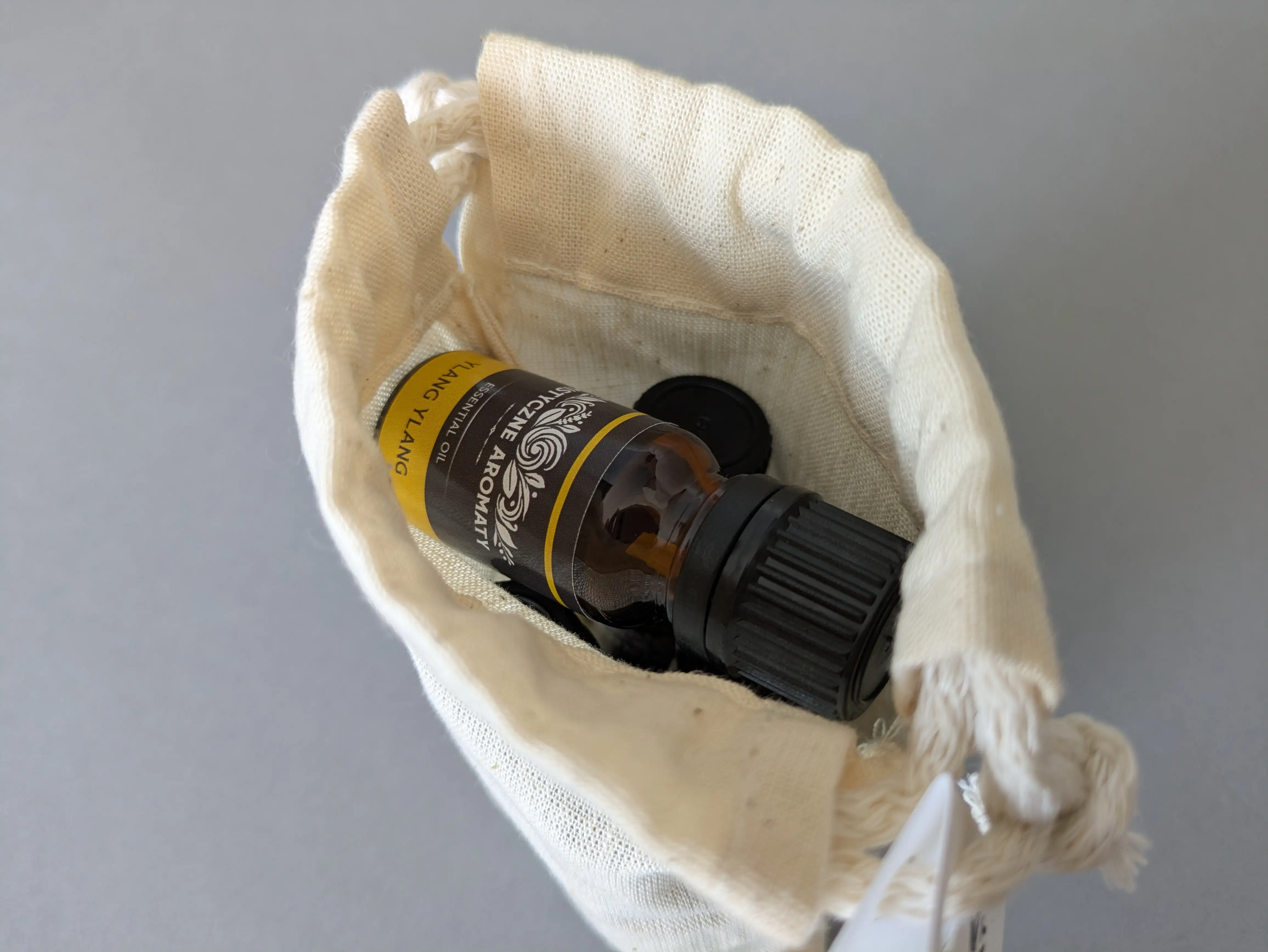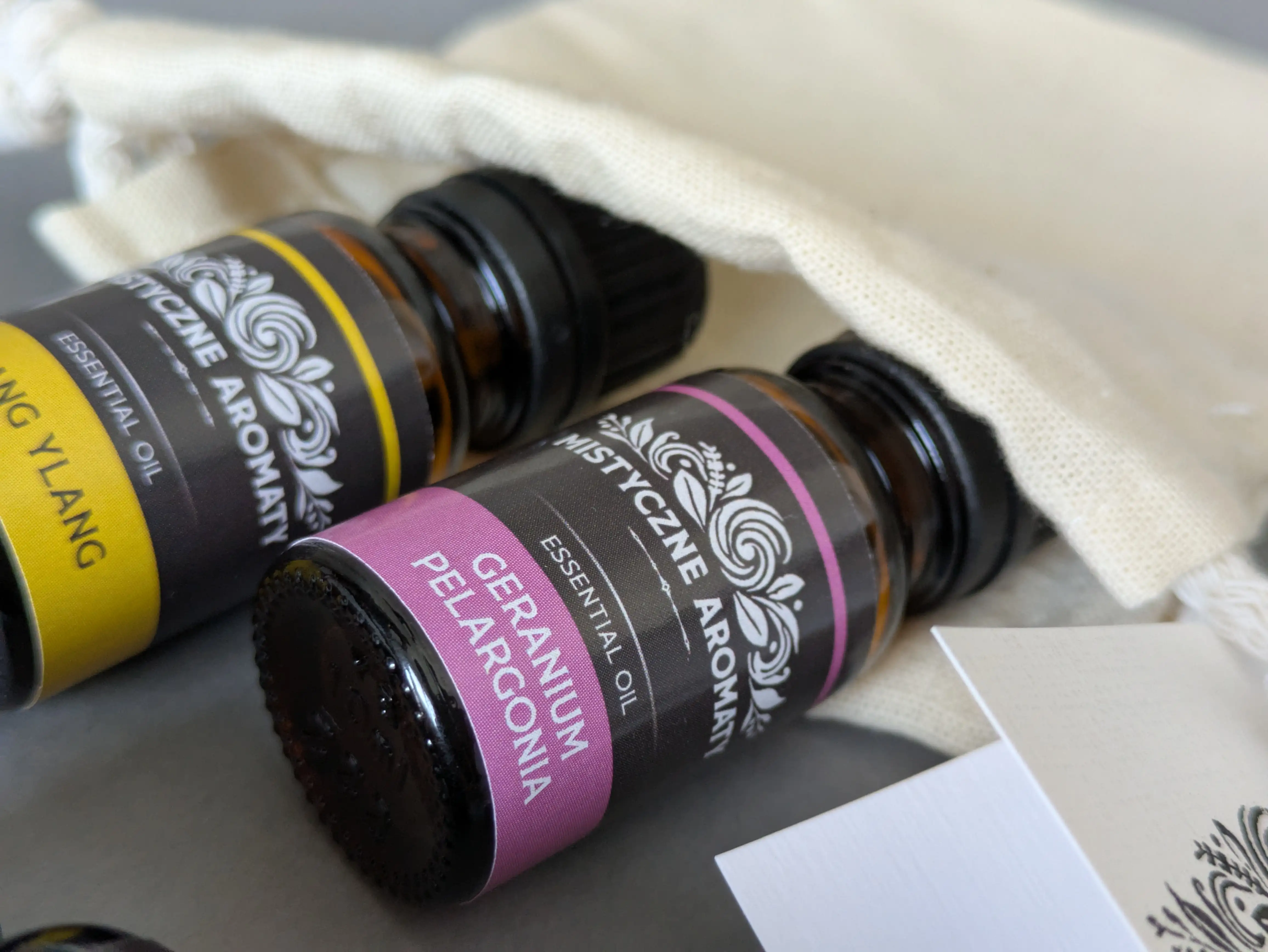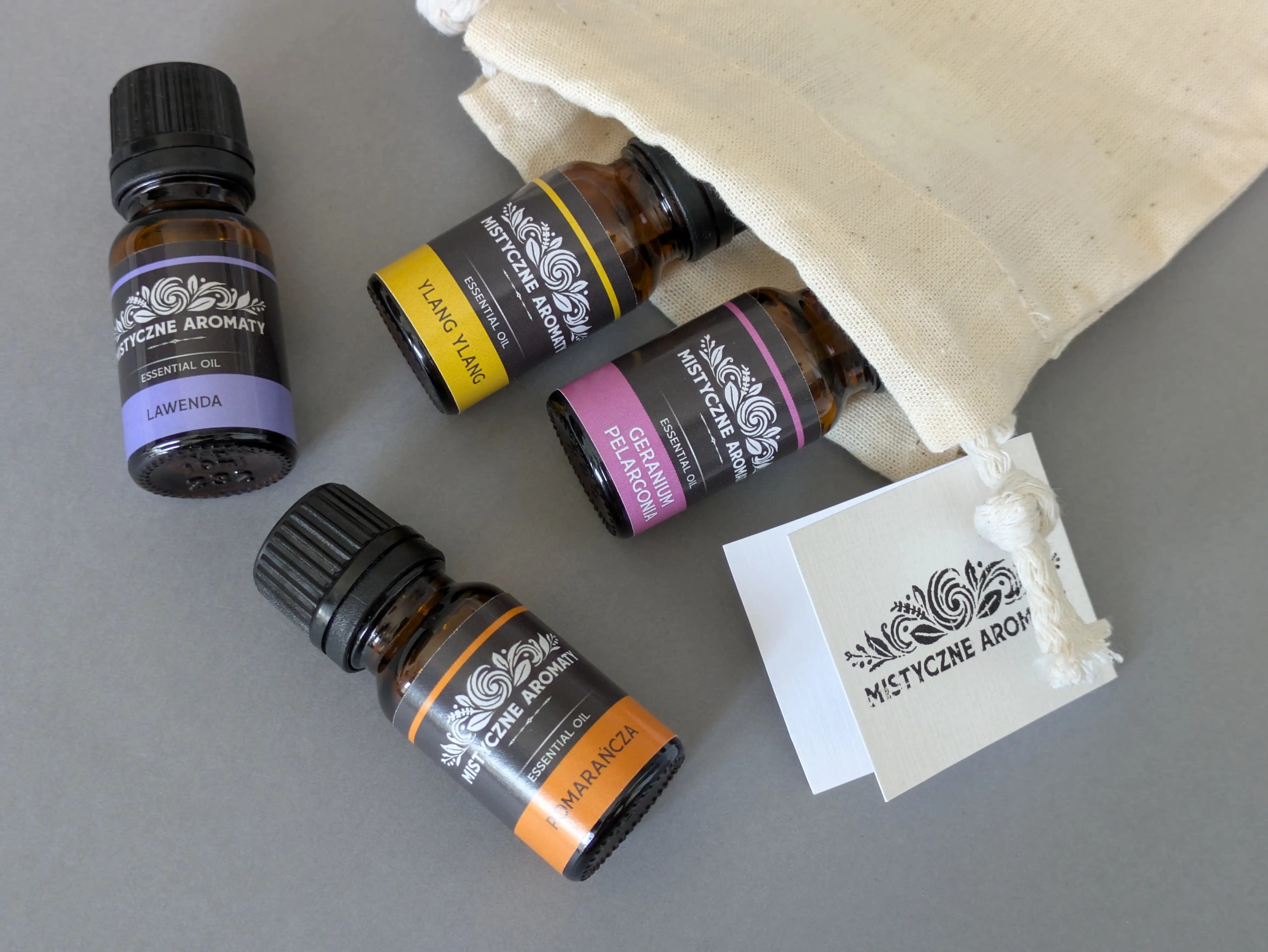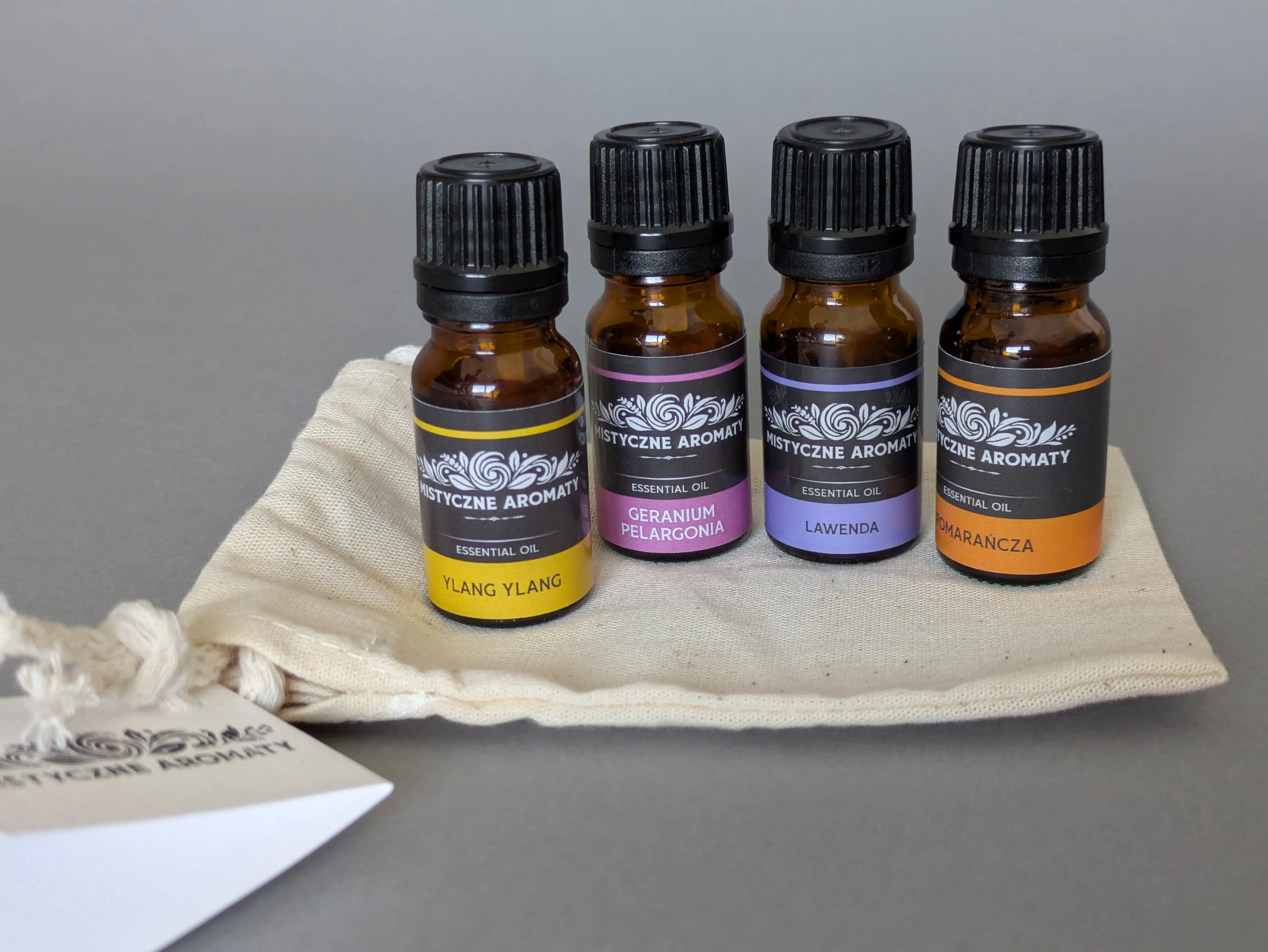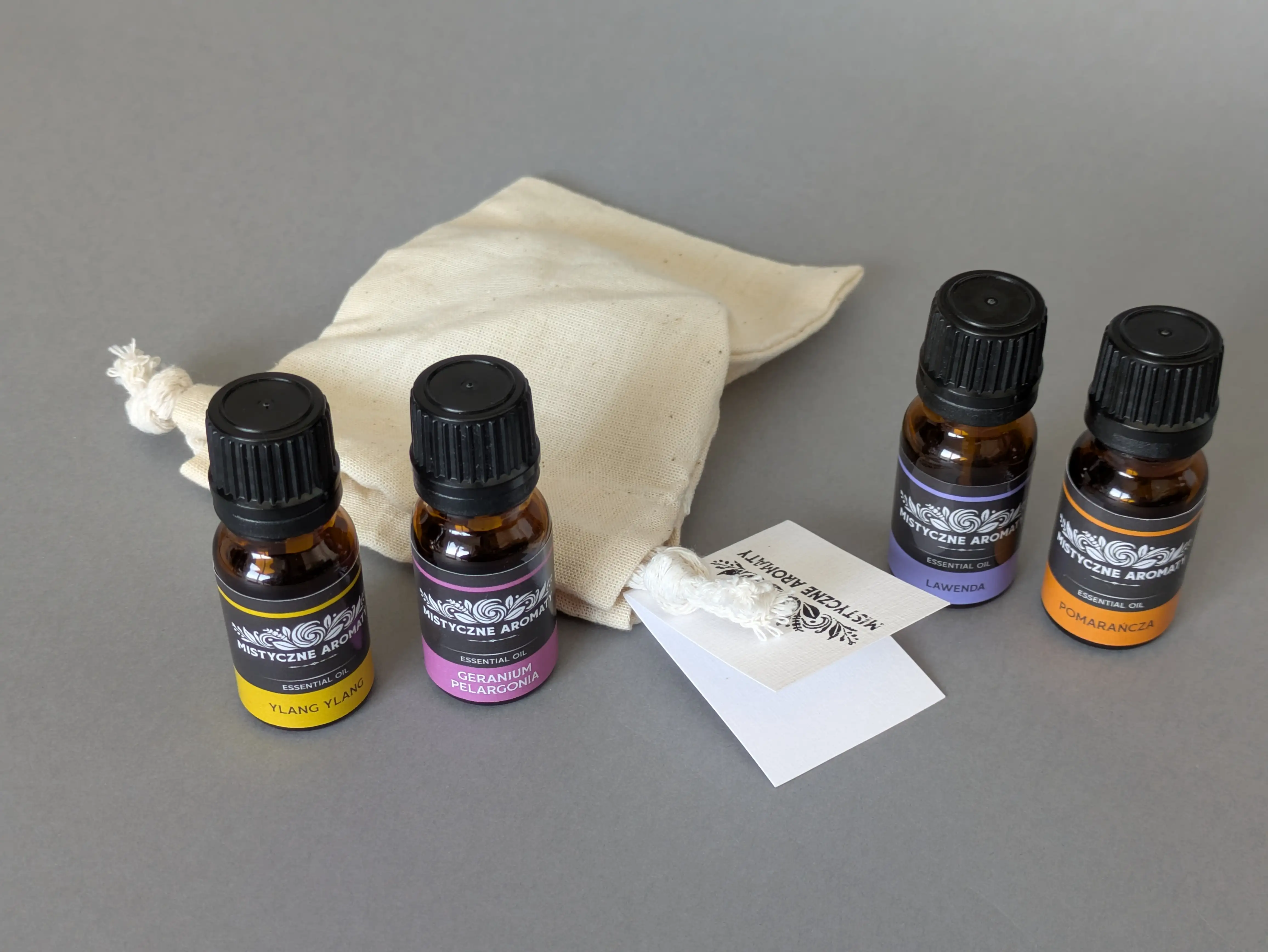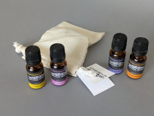 Zestaw 4 naturalnych olejków eterycznych 10ml z kroplomierzami (lawenda, ylang ylang, geranium, pomarańcza) w eleganckim, ręcznie wykonanym bawełnianym woreczku.