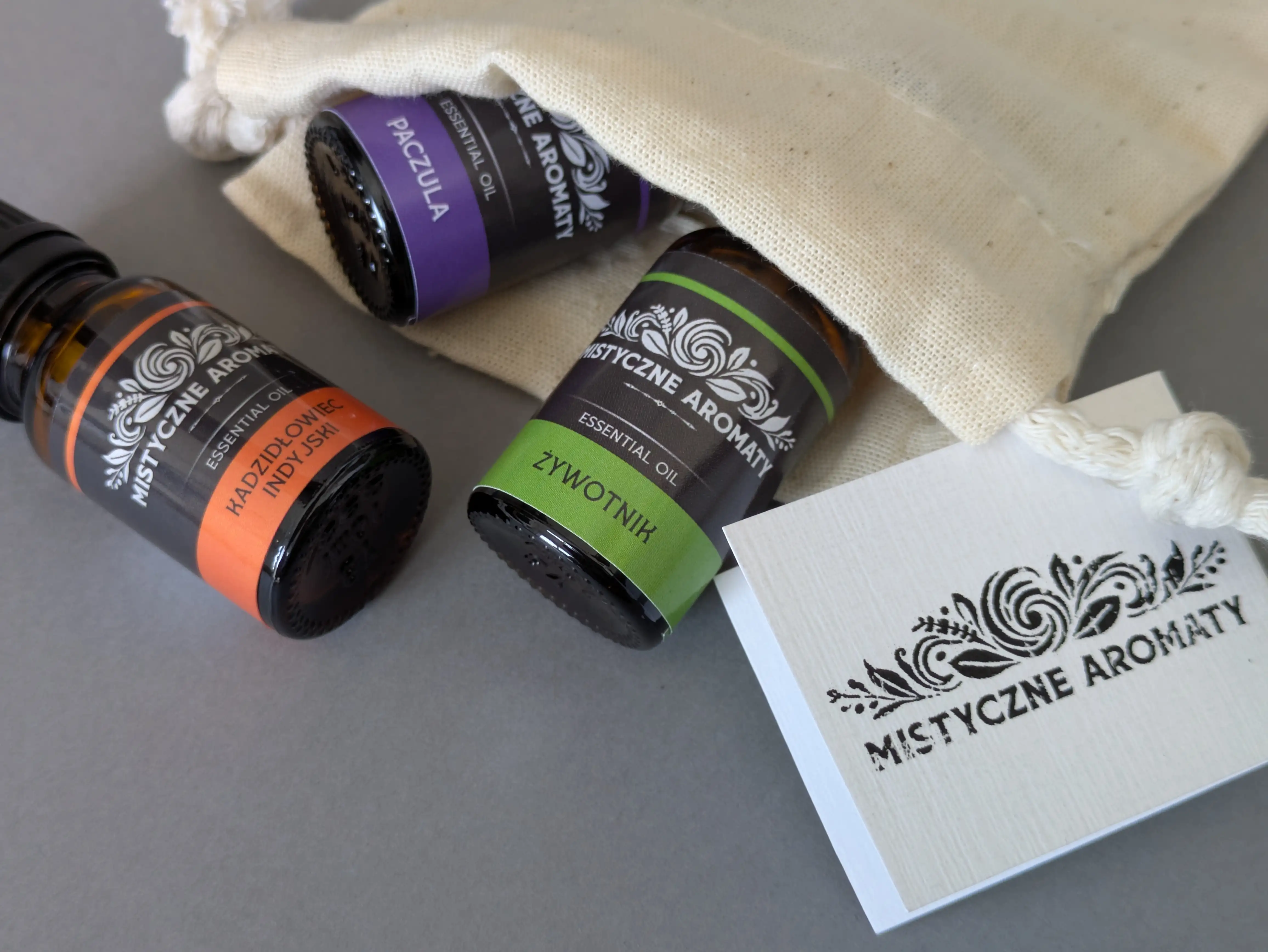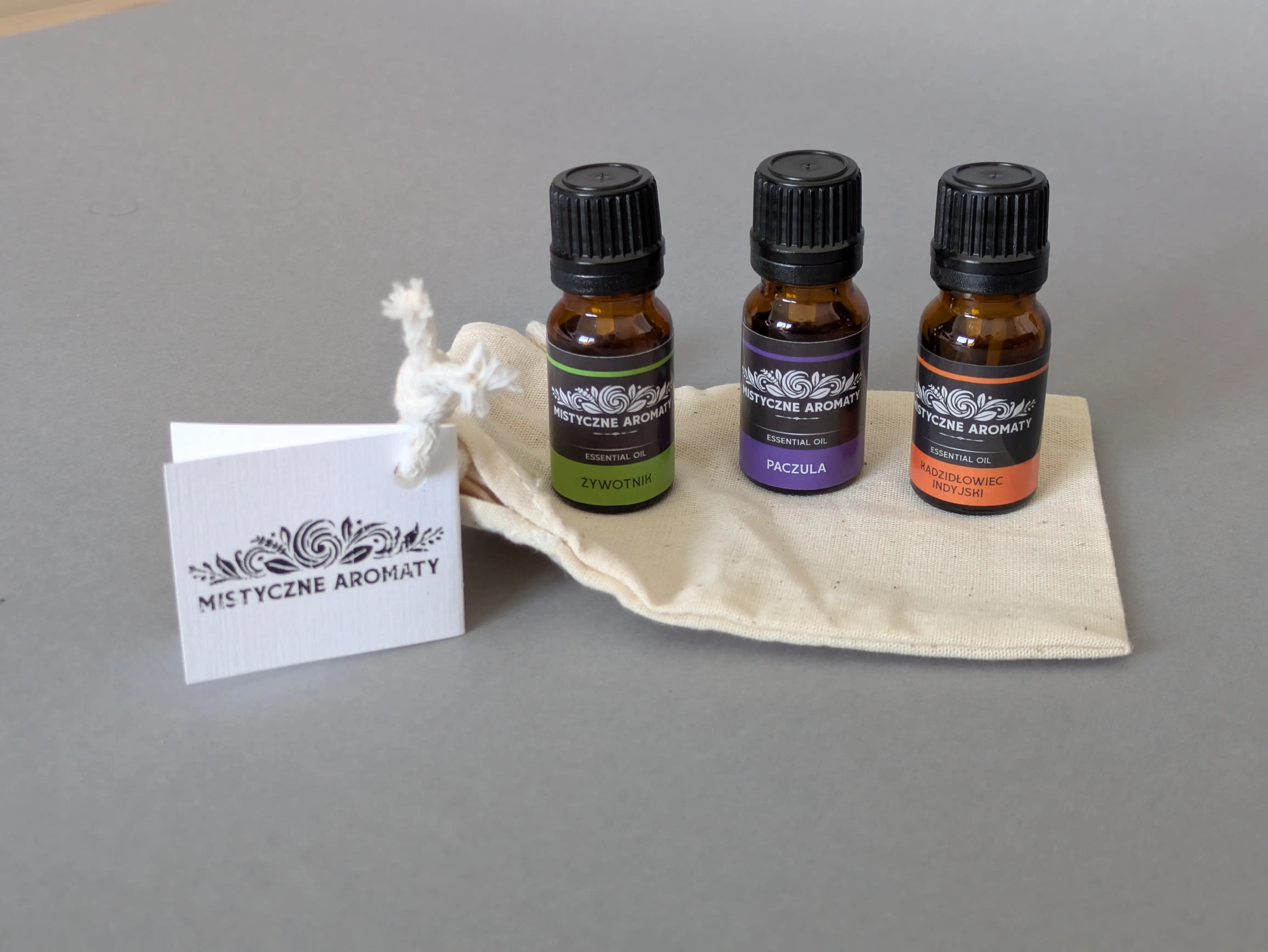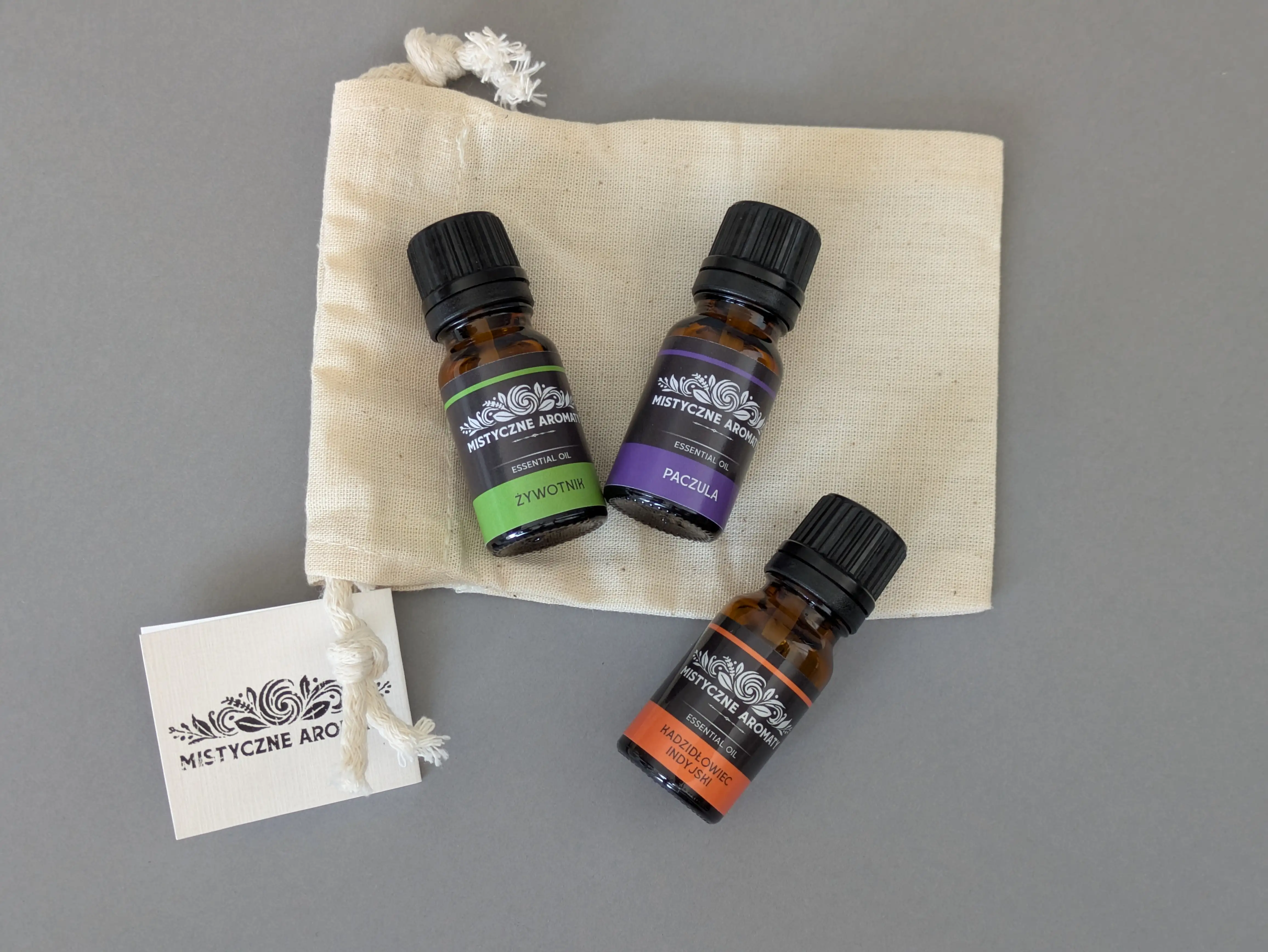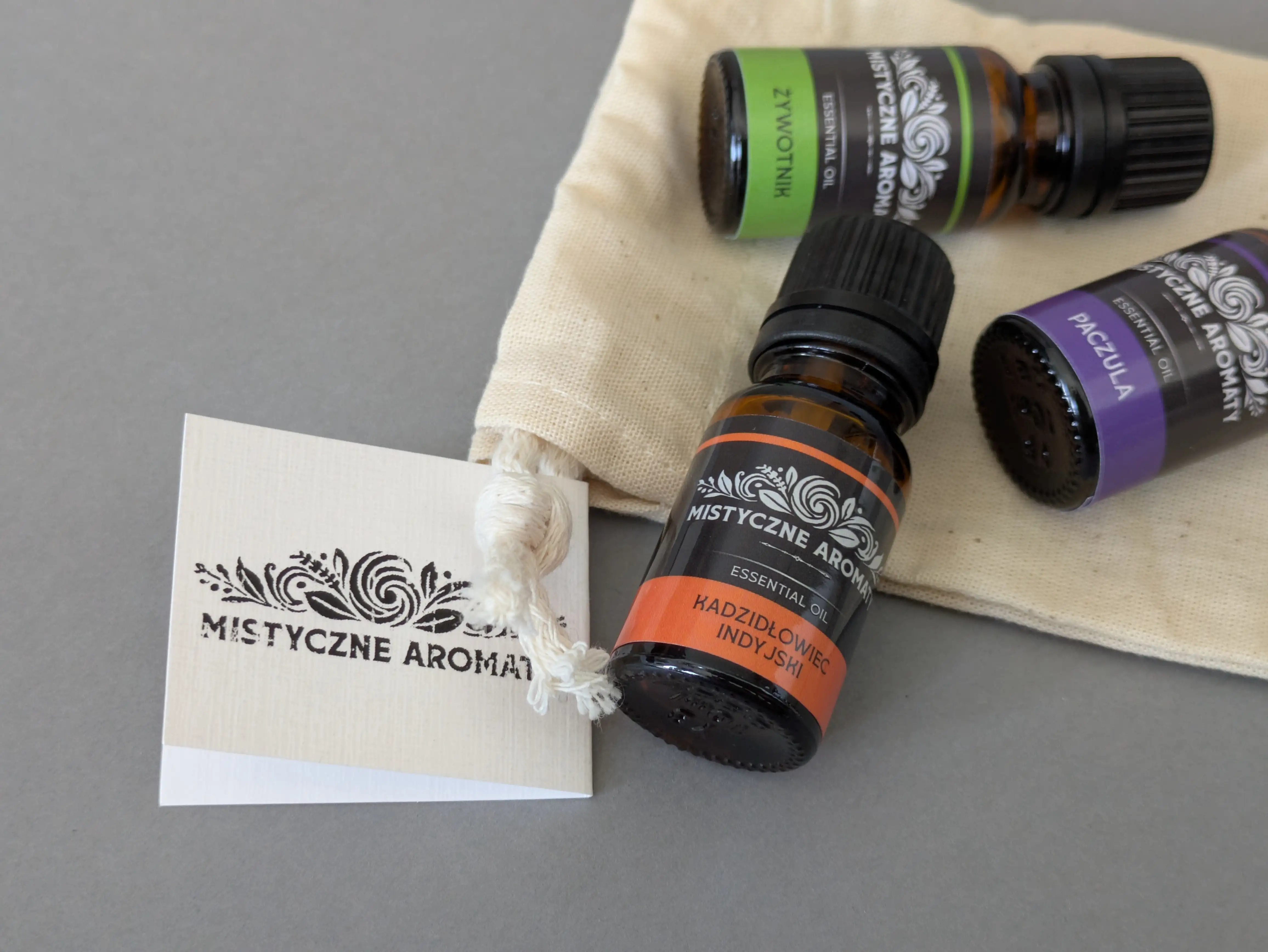 Zestaw 3 naturalnych olejków eterycznych (kadzidłowiec indyjski, żywotnik (tuja), paczula) w eleganckim, ręcznie wykonanym woreczku z bawełny.